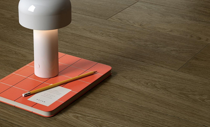 The tile's graphic language is built around the image of noble oak. The pattern captures the structure characteristic of the species: longitudinal grain lines with gentle undulations, natural tonal gradations from light to deeper hues, the faintest traces of wood fibre. At the same time, the surface is free of those features that would be considered flaws in real timber: no conspicuous knots, no abrupt colour shifts, no irregularities in texture. The result is a finish that reads as premium-grade natural parquet yet carries all the advantages of porcelain stoneware.