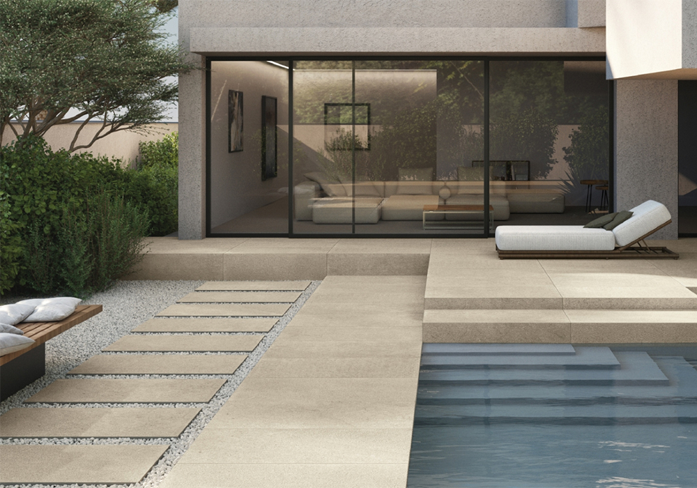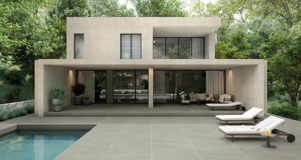 Когда проект выходит за пределы четырех стен, в игру вступает Cosmos X2. Здесь толщина вырастает до 20 мм, а поверхность становится противоскользящей – не для галочки, а по-настоящему безопасной даже под дождем или у кромки бассейна. Sand и Grey в этой версии решают задачу визуального перетекания: терраса становится продолжением гостиной, садовая дорожка – частью прихожей, фасад – элементом общей композиции.