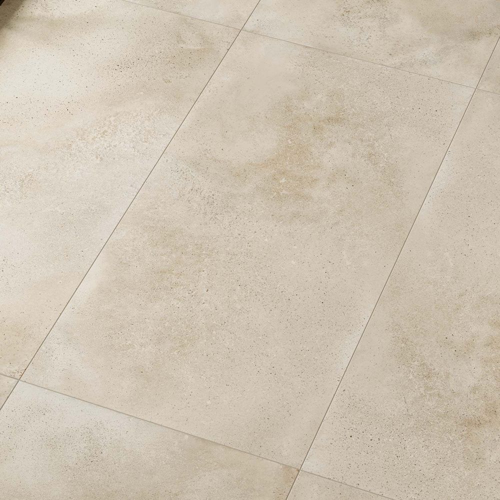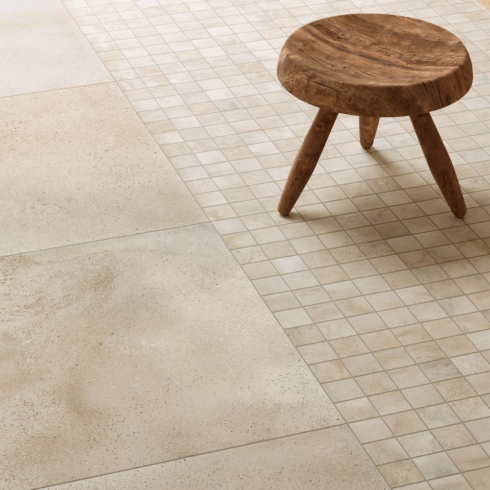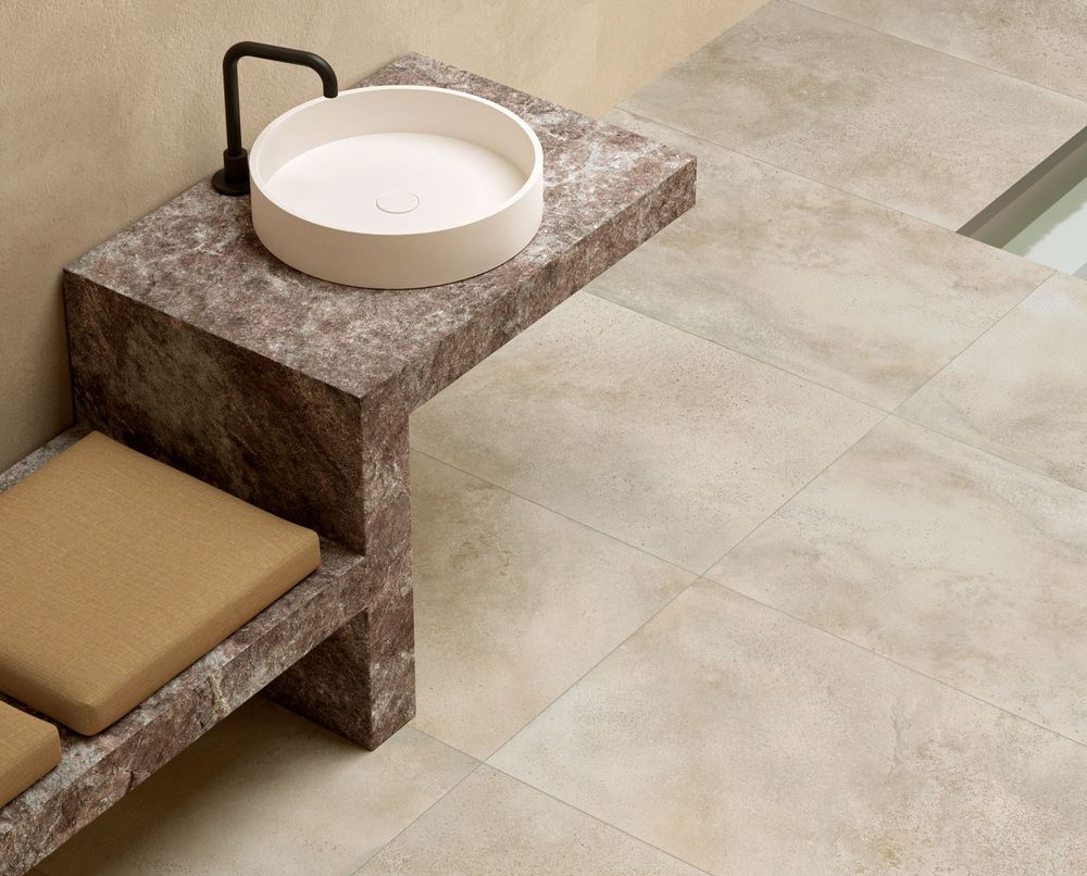 Крим предлагает другое прочтение бетонной эстетики. Светло-бежевый фон с динамичной текстурой и глубокими полутонами, которые местами уходят в более тёмные зоны. Поверхность живая, с выраженной игрой света — при разном освещении Крим меняет своё восприятие, становится то теплее, то холоднее. Этот оттенок смягчает строгость бетона, делает его более домашним, приближенным к натуральным материалам вроде песчаника или травертина.